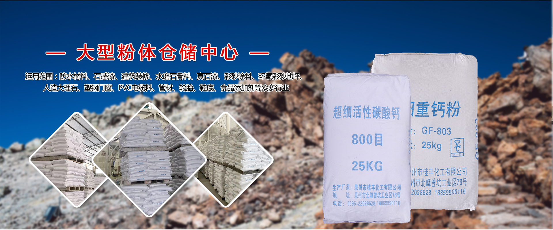 泉州市桂豐化工有限公司是一家有十幾年粉體技術研究和生產經驗的企業,公司集粉體技術開發(fā)、礦山開采、粉體生產為一體。主營:滑石粉、重質碳酸鈣粉、活性碳酸鈣、方解石粉、大理石砂等產品。專業生產十大系列10目-8000目石粉產品。得益于優(yōu)良的礦山礦石資源,我司生產的產品具有白度高,純度高,粉碎充分,粒度分布均勻,化學成份穩(wěn)定等特點。產品廣泛運用于醫藥、化妝品、食品、鞋材、家裝、造紙、橡膠、塑料、涂料、油漆、油墨、陶瓷、電線、電纜等眾多行業。 經過十多年快速的發(fā)展,我司擁有了三個礦石粉生產基地,三十多臺套的生產設備,員工規(guī)模達到一百五十多人。多年來,公司堅持以市場為導向,不斷加大科技投入,與國內大學院校,專業粉體研究機構保持常年合作,實行產學研銷一體發(fā)展。針對不同行業不同產品客戶的差異化需求,制定一對一的技術支持與生產跟進服務,把“提高客戶產品品質,降低生產成本,實現客戶效益提升”作為公司的服務宗旨。目前,公司產品在國內大部分省份均有銷售,并出口到了國外市場。